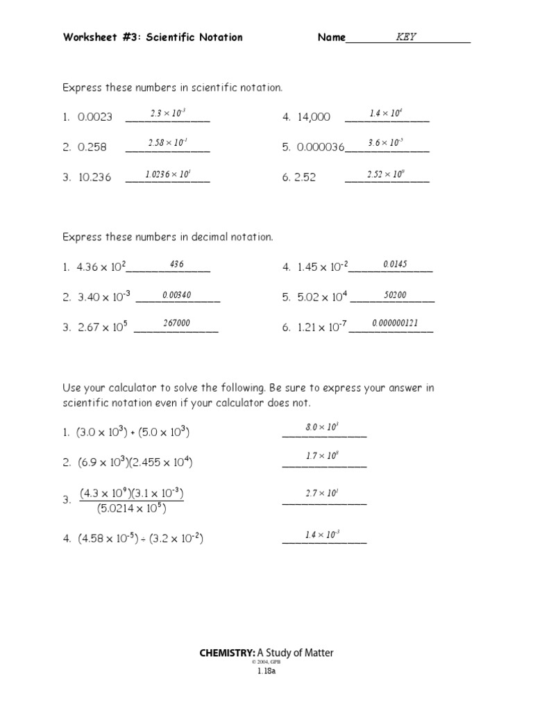 ANSWER KEY chemistry: scientific notation worksheet 1. 5,200 2. 0.000965 3. 0.085 4. 27,100 5. 36 6. 645.2 7. 0.877 8. 0.0064 Part B 1.
