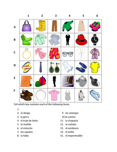 Worksheet - Clothing Vocabulary Word List - A printable list of clothing vocabulary where students have to translate the words into Spanish. 16. Worksheet - ¿Cuánto cuesta? - A worksheet for students to use as prompt for a speaking activity or for information for a written piece of work.