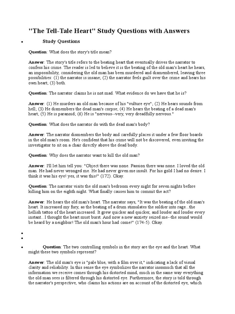 "The Tell-Tale Heart" Study Questions with Answers. Study Questions. Question: What does the story's title mean? Answer: The story's title refers to the ... Rating: 5 · 1 vote