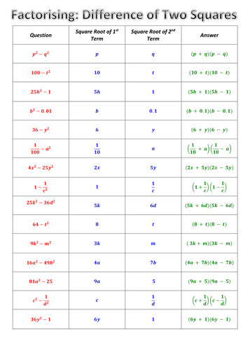Factoring, Algebra, Difference of Squares Worksheets by Mathologist 1 $2.00 PDF (624.29 KB) Factoring, Algebra, Difference of Squares WorksheetsWorksheet includes 30 questions that will help students master Difference of Squares.