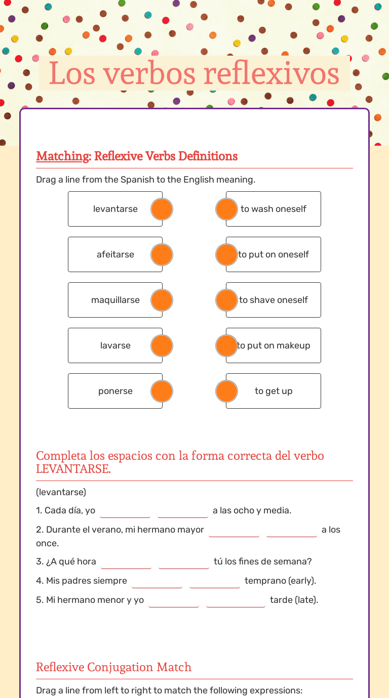 Verbos reflexivos (Spanish Reflexive verbs) Worksheet 2. I have taught all levels from kindergarten to adult continuing education. I love languages and am constantly working on improving and adding to them. I believe that if students have fun, they will learn faster and remember longer. I try to have students speak in the target language as ...