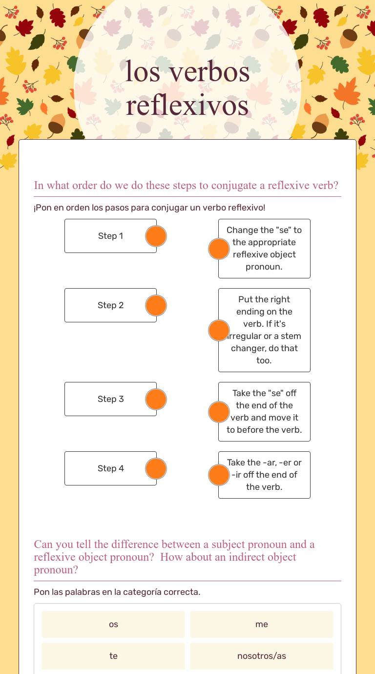 In what order do we do these steps to conjugate a reflexive verb? ¡Pon en orden los pasos para conjugar un verbo reflexivo! Rating: 5 · 4 reviews