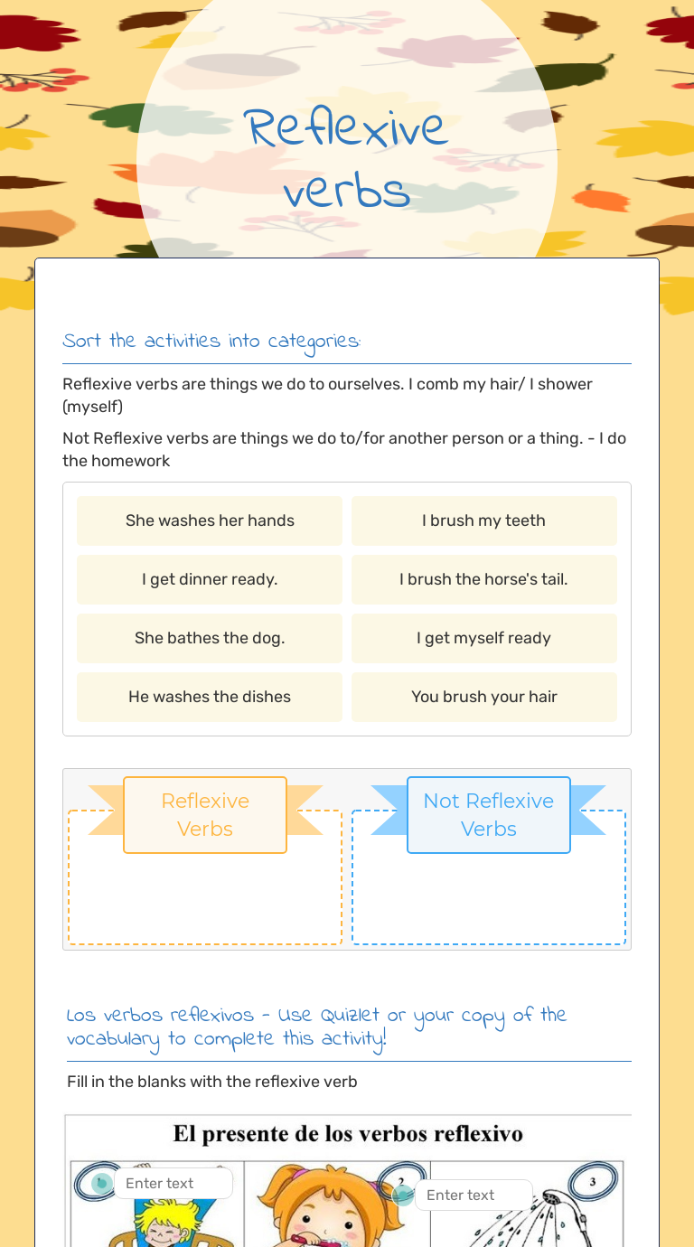 Los verbos reflexivos. Actividad para practicar los verbos reflexivos de la rutina diaria. ID: 1326443. Idioma: español (o castellano) Asignatura: Español como Lengua Extranjera (ELE) Curso/nivel: Iniciante. Edad: 10+. Tema principal: Verbos reflexivos.