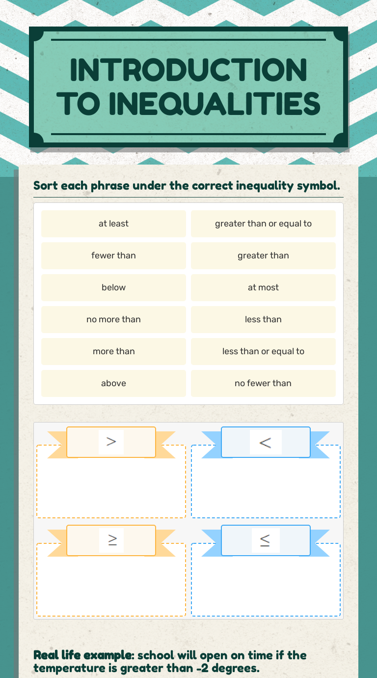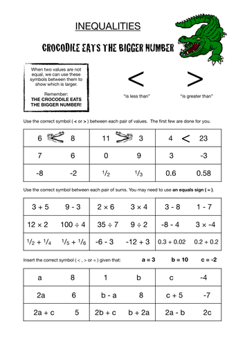 Super Teacher Worksheets - www.superteacherworksheets.com Introduction to Inequalities Name: Intermediate Single Variable An inequality is a pair of expressions or numbers that are not equal. You can use these signs to express an inequality: > greater than ≥ greater than or equal to < less than ≤ less than or equal to