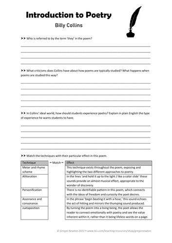 Displaying top 8 worksheets found for - Poetry Elements. Some of the worksheets for this concept are The elements of poetry, Elements of poetry, Elements of poetry, Defining poetry and characteristics of poetry, Literary elements handout the following are literary, Block 4 poetry, Reading strategies and literary elements, 4th literary elements. View Elements of Poetry Worksheet - Answer Key.pdf from ENGLISH 123 at Bayside High School, Bayside. 4/14/2020 Elements of Poetry Answer Key - HelpTeaching.com Elements of Poetry Answer Key 1. Lines