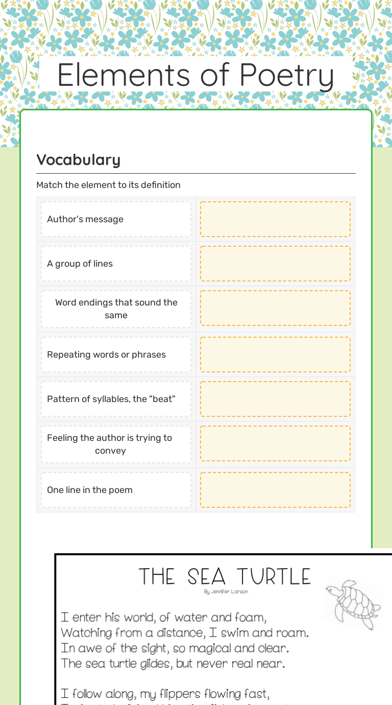 Elements Of Poetry Worksheet. Elements Of Poetry Worksheet - Worksheets are definitely the backbone to students getting to know and greedy principles taught through the teacher. Making your individual worksheets is easy, and it allows you to include simply the right fabric that you desire to ensure your pupils can be taught and commit to memory. Here are directions on how to make worksheets in 5 easy steps.