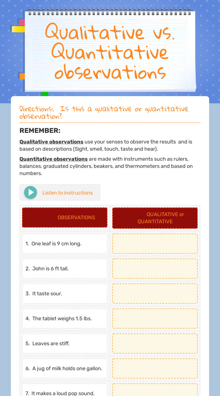 Quantitative work sheet all of the observations in this worksheet were qualitative. Quant the humidity level is 89 2. Qualitative quantitative a b a l l a s p a g e 1 worksheet. Qualitative quantitative powerpoint 1. Show answer example 3. Qualitative observationsare observations that describe qualities of something.