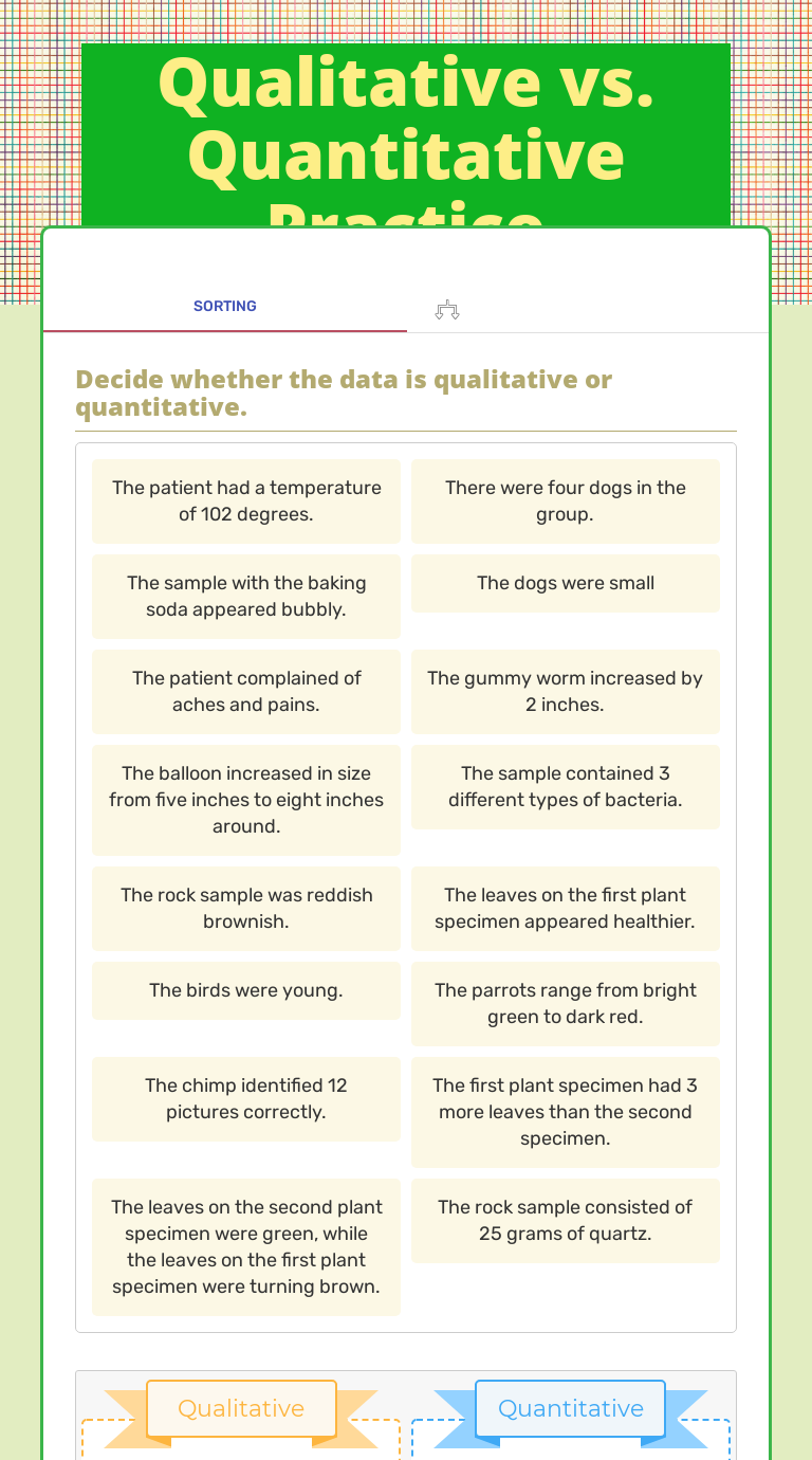 Qualitative Vs Quantitative Worksheets Teaching Resources Tpt . Retrieving Data Part IV. If the answer to any of these questions is No it may be better to read other articles first. This is because text search can be performed say on a wordcontent within a paragraph or for an identifier or an element of the identifier- and the results Spread to ...