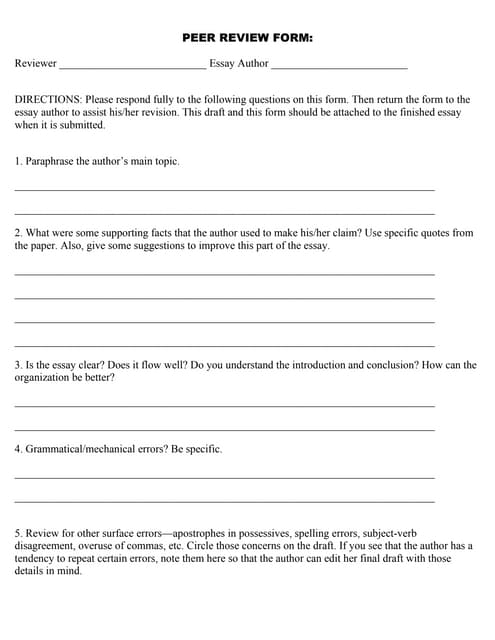 Knowing how to write a college essay is a useful skill for anyone who plans to go to college. Most colleges and universities ask you to submit a writing sample with your application. As a student, you’ll also write essays in your courses. I... Word Document File. This is a brief (two-sided) peer review sheet for use with personal narratives and college admissions essays. Provides instructions to readers and writers, and a series of eleven core questions intended to guide readers toward providing helpful, targeted feedback to writers. Some questions have mu. Peer Review/Workshop Sheet: Essay #1 - Analyzing a Single Primary Text *Reviewers will review each writer's paper for (at least) 15 minutes, complete this form (front/back) for each paper reviewed, and discuss comments with the writer. Writers will turn in peer comments with final copy. Name of writer:_____ When finished, discuss your suggestions with the paper's author, bring both the essay and your peer review to me for a grade, and then give both this worksheet ...2 pages