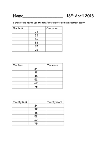 One more one less ten more ten less - Worksheets and Printables by Olivia Walker 217 $3.25 PDF One more one less ten more ten less - This is a fabulous set of 26 worksheets that will help teach students to add and subtract one and ten onto a number. All worksheets are black and white printables that require no prep, just print and go.