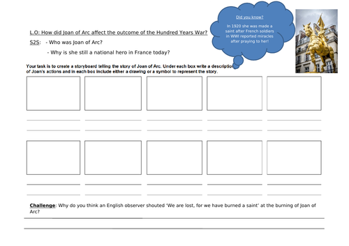 A great homework activity, cover work or home learning worksheet. The students have to research Joan of Arc using the links at the bottom of the page to complete the acivities. Meanwhile she are a great way to broaden students' understanding of the topic they are studying.
