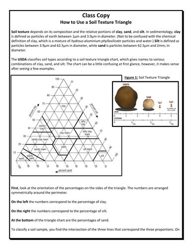"Sensory Soil" worksheet Teaching Activity 1. Take a walk around the school to collect soil samples from three or four different areas that seem to have different soils (playground, garden bed, near a path, under a tree, etc). 2. When the class returns to the gathering place, divide students into four groups each with one of the soil samples. Soil Texture Diagram Worksheet Answers. The Soil Textural Triangle. Free Soil Texture printable Science worksheets for 2nd Grade students. Click on the image to view or download the PDF version. Related posts: Plant Matters: How Plants Travel. Layers Of Soil. Taste Map. Compost Fun Page. Soil Texture Worksheet. Directions: Using your soil texture chart and example, determine the following soil textures using the percentages given. % sand % silt % clay Soil Texture. example 75 10 15 sandy loam. 42. 21. 37 clay loam. 27. 52 21 silt loam. 15. 35 50 clay. 64 30 6. sandy loam. 50 10 40 sandy clay ... The proportion of sand, silt, and clay in a soil's composition determines its texture.It depends on the proportions of soil particles.Wats the aw set
