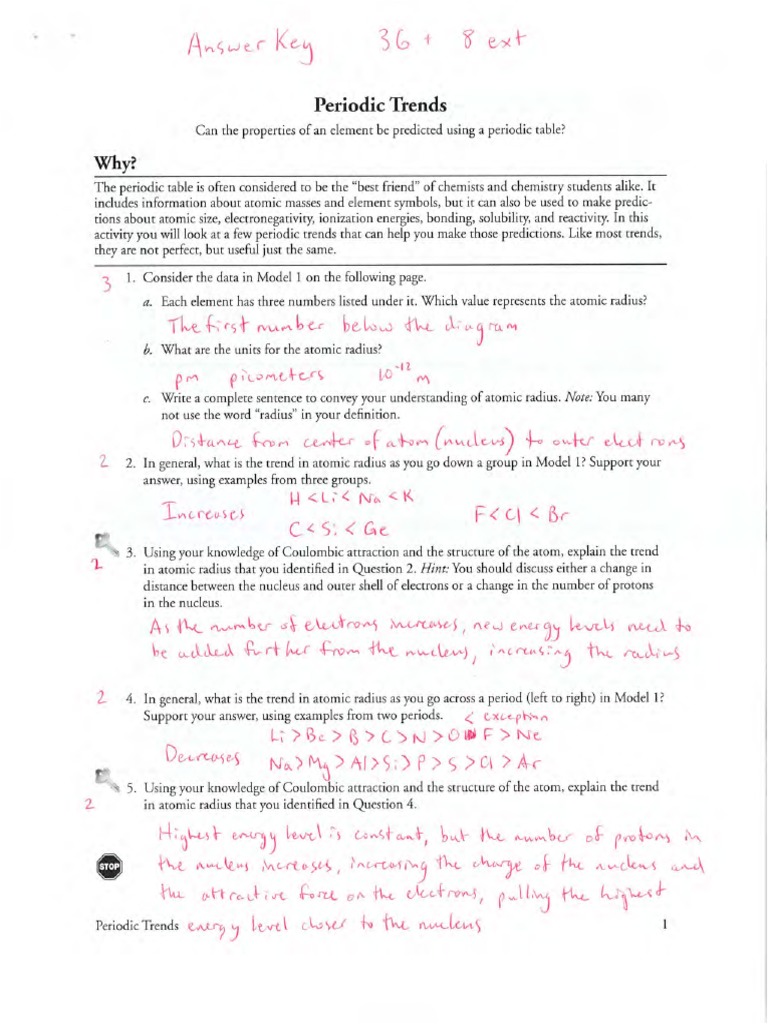 Trends in the periodic table worksheet answers. You go from periodic trends on worksheet answers to distinguish between the energy, halogens have undetermined first. Ionic radii follow the same vertical trend as atomic radii; that is, for ions... The results for periodic trends worksheet answers key. Li is the largest because it has the smallest nuclear charge and pulls the. Therefore the important factor is the nuclear charge. Periodic trends worksheet answer key. Ws 2 6 periodic table in this periodic table worksheet students answer questions about periods and families of the periodic ... Trends In The Periodic Table Worksheet Answer Key is available in our book collection an online access to it is set as public so you can download it instantly. Our book servers saves in multiple locations, allowing you to get the most less latency time to download any of our books like this one. Describe the trends in the atomic size of elements within groups and across periods in the periodic table. Provide examples. Explain how ions form. Provide examples. Describe the trends in first ionization energy within groups and across periods in the periodic table. Provide examples.