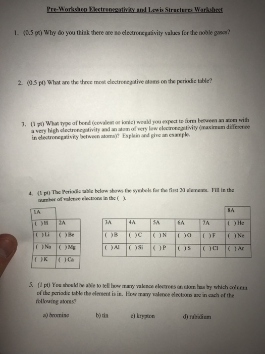 Oct 15, 2020 · Valence Electrons Worksheets Answer Keys admin October 15, 2020 Some of the worksheets below are Valence Electrons Worksheets with Answer Keys, learn how to find the number of valence electron for given elements, learn what an octet rule is and its role in bonding between atoms with several interesting exercises and activities.