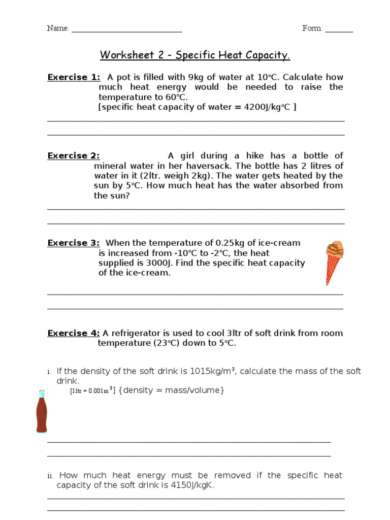 Download Ebook Calculating Specific Heat Capacity Worksheet With Answers 4. Calculate the heat capacity of a piece of wood if 1500.0 g of the wood absorbs 6 104 joules of heat, and its temperature changes from 320C to