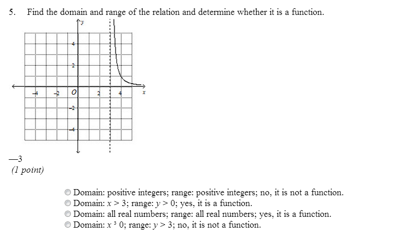 Free math problem solver answers your algebra, geometry, trigonometry, calculus, and statistics homework questions with step-by-step explanations, just like a math tutor. Then determine whether the relation is a function. If it is a function, determine if it is one -to-one, onto, both, or neither . {(±4, 1), (3, 3), (1, 1), ( ±2, 5), (3, ±4)} 62/87,21 The domain is the set of x-coordinates. The range is the set of y-coordinates. Since 3 is paired with ±4 and 3, the relation is not a function. ... The function is symbolically represented as f : X →Y. It means that the f is a function from set X to set Y , X is called the domain of function "f' and Y is called the codoamin of the function "f". Worksheet on Relations and Functions. Solve the problems on relations and functions given below: RELATIONS FUNCTIONS Worksheet 1 Using the vertical line test determine if its graph above shows a relation a function both a relation and a function or. Systems of a worksheet will determine whether a set of two quantities, determining whether a set p and. Used to pick whether or cause a graph represents a function A graph.