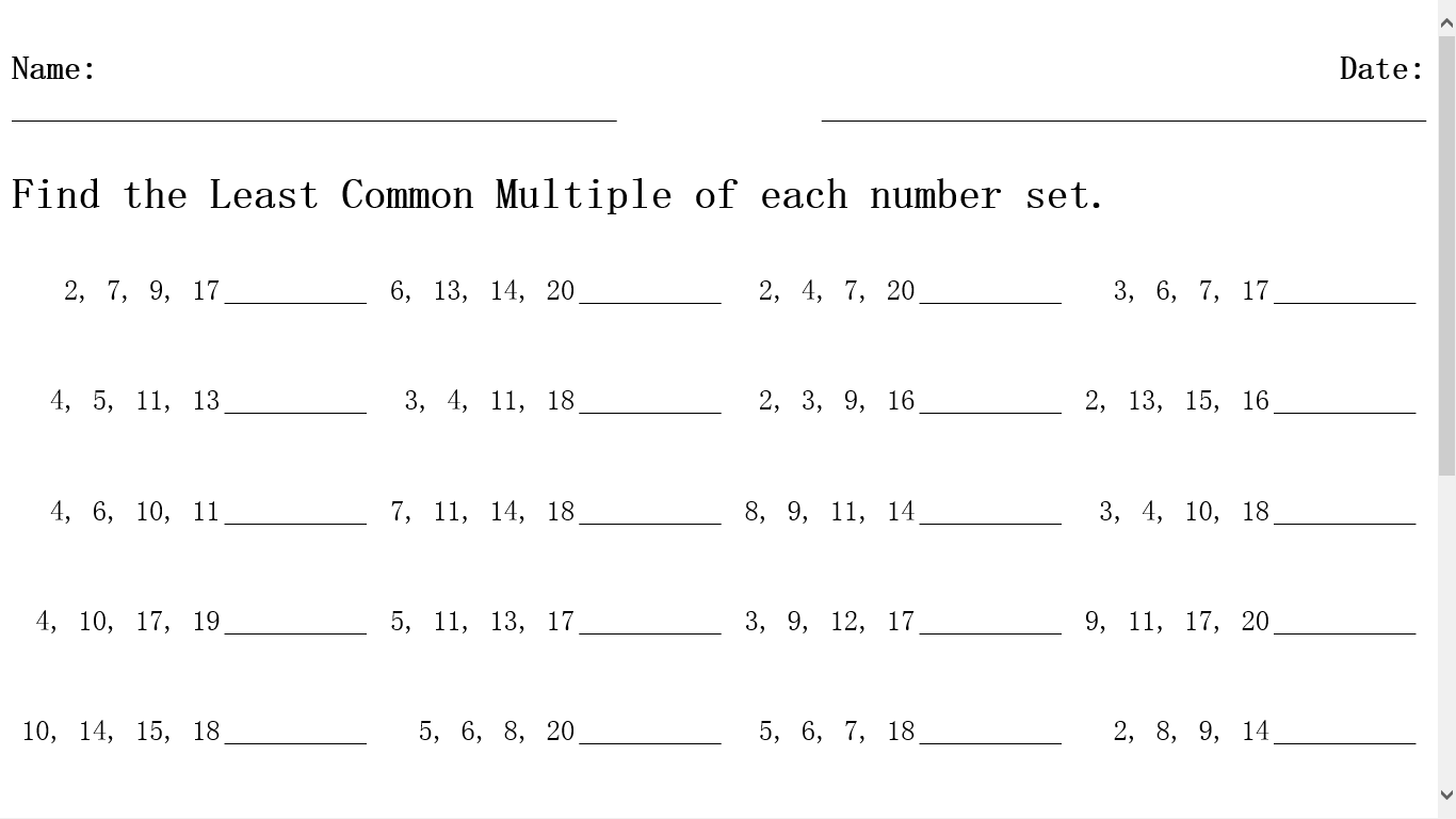 Least Common Multiple (LCM) Worksheets This extensive collection of printable worksheets on LCM is designed and recommended for students of grade 5 through grade 8. The exercises covered in this module include finding common multiples, finding the least common multiple for a set of numbers and much more! Explore some of these handouts for free!