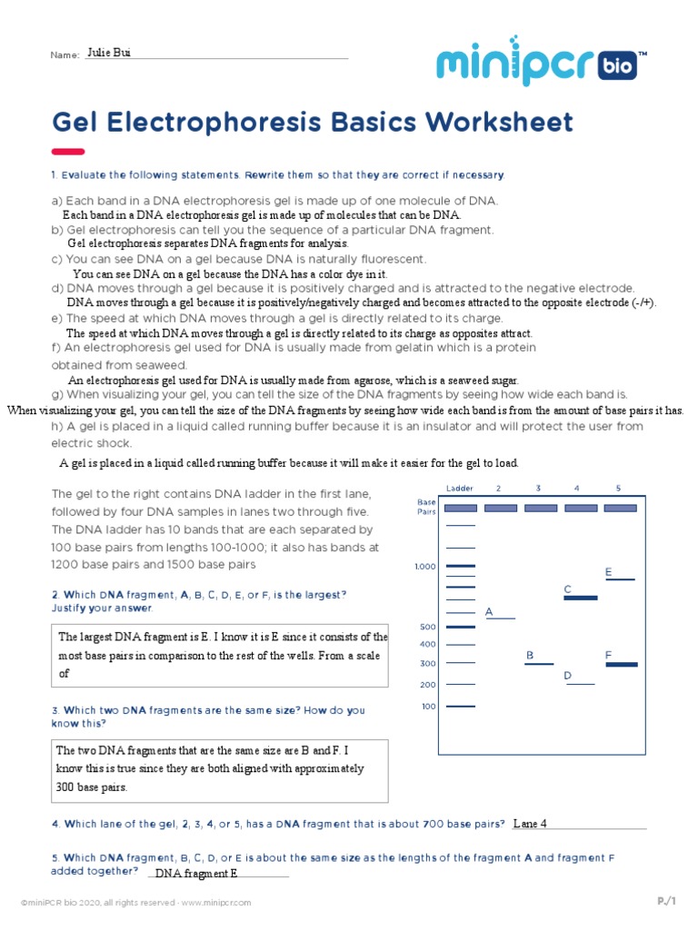Gel electrophoresis Gel electrophoresis is a method of separating DNA fragments by movement through a Jello-like substance called agarose. Derived from a seaweed polysaccharide, agarose gels form small pores that act as sieves to separate DNA based on size; whereby smaller DNA molecules move through the pores faster and easier than larger ... Results 1 - 24 of 287 — Four Gel Electrophoresis crime scenes for students to evaluate (including a key). Easy to adapt or copy to create new problems. Subjects:. PCR / Gel Electrophoresis Practice Worksheet. This book provides science educators with a comprehensive selection of innovative tools, activities, and high-quality instructional resources for enlivening lessons across the science disciplines. It features over 300 classroom-ready activities ranging from word-based problem-solving exercises ...