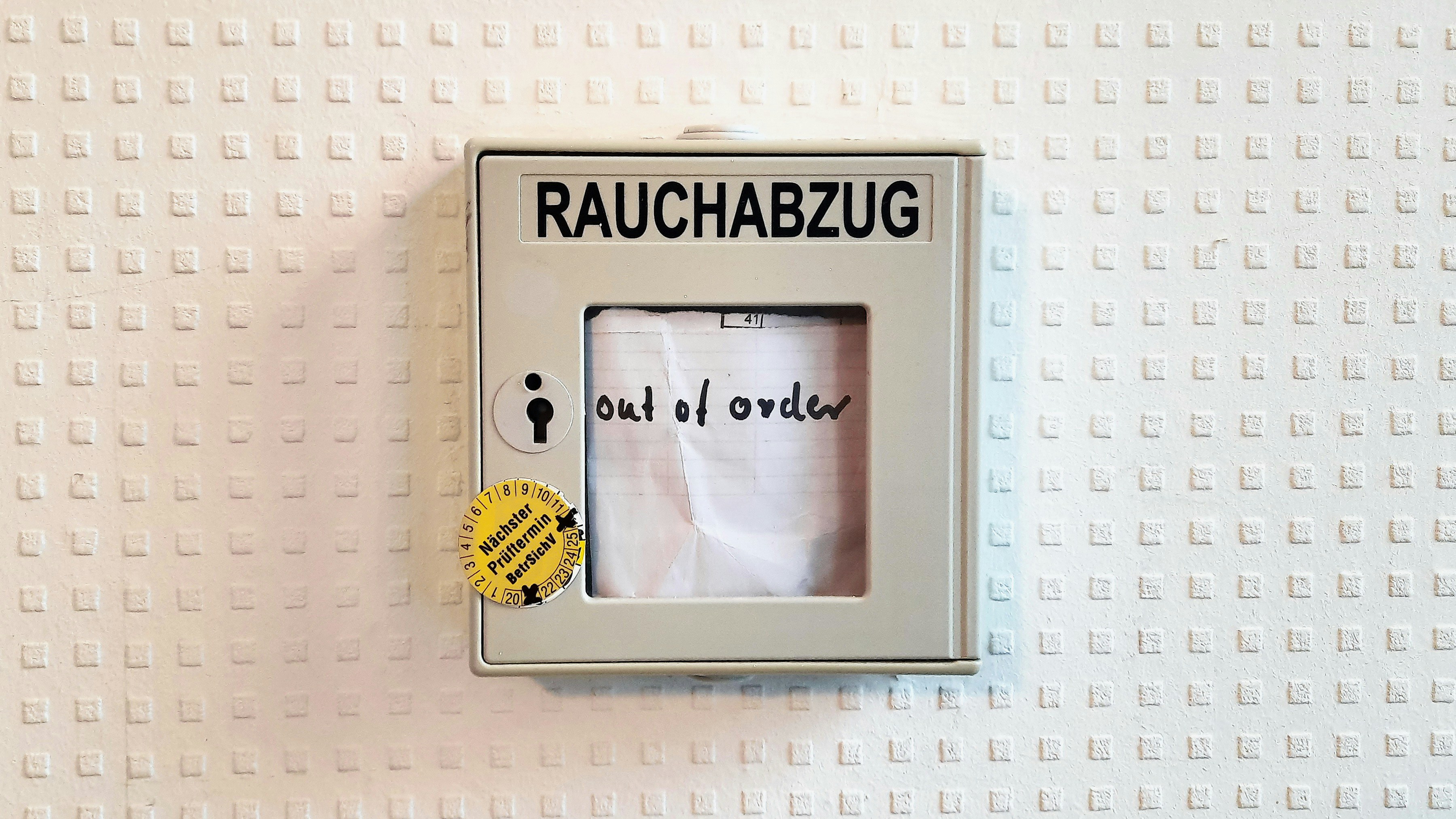 A handwritten "out of order" note in a German smoke outlet control. A cool picture for a "500 Internal server error" page.