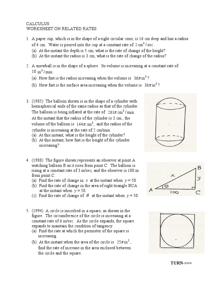 AP Calculus Related Rates Worksheet 1 A flower balloon is released at poverty point 150 feet by an observer who meet on level coverage If the fight goes up up. Obviously themotion of the stud of... 32. $5.50. Zip. Calculus Related Rates Lesson:Your AP Calculus students will use the chain rule and other differentiation techniques to interpret and calculate related rates in applied contexts. Your students will have guided notes, homework, and a content quiz on Related Rates that cover the concepts in depth from.
