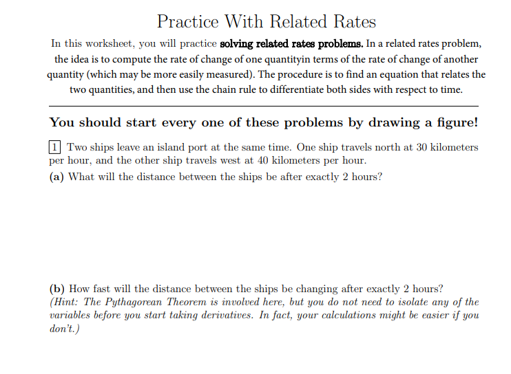 Calculus related rates worksheet. Printable Math Worksheets for Practice - PDF Format. Thank you for viewing Calculus Related Rates Worksheet. If you find any copyright protected images of yours, please contact us and we will remove it. We don't intend to display any copyright protected images. We hope that you are able to find the math facts and worksheets that you are looking ... Section 3-11 : Related Rates. In the following assume that x x and y y are both functions of t t. Given x = −2 x = − 2, y =1 y = 1 and x′ =−4 x ′ = − 4 determine y′ y ′ for the following equation. 6y2 +x2 = 2 −x3e4−4y 6 y 2 + x 2 = 2 − x 3 e 4 − 4 y Solution. In the following assume that x x, y y and z z are all ... AP Calculus: Related Rate Worksheet Calculator permitted. For each of the answers, Draw and label a diagram, label all quantities, find the numeric answer, using appropriate units, then give a ‘real-world’ explanation of the answer. Show all “position” and “rate” equations. 1. (02 AB) A container has the shape of an open right ... AP Calculus AB Worksheet Related Rates If several variables that are functions of time t are related by an equation, we can obtain a relation involving their rates of change by differentiating with respect to t. The key to solving related rate problems is finding the equation that relates the varaibles. If