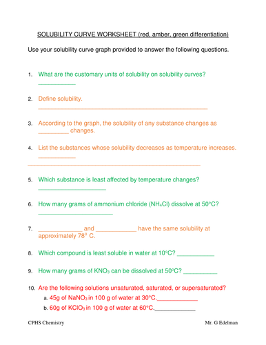 PDF Worksheet: Solubility Graphs Worksheet: Solubility Graphs. Name_. Use the provided solubility graph to answer the following questions: For questions 1 - 4 an amount of solute is given, and a temperature is stated. If all of the solute could be dissolved in 100 g of water at the given temperature... PDF Solubility Graph Worksheet Solubility Graph Worksheet. 1. Why do the temperatures on the graph only go from 0º C to 100º C ? Water changes to a gas at 100º C and will no 3. Which two substances have the same solubility at 80º C ?_ sodium chloride, potassium chlorate 4.Which substance's solubility changes the most from...