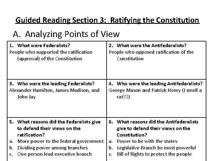 2-5 Reading Comprehension Ratifying the Constitution.pdf BELLRINGER WORKSHEET. Ratifying the Constitution. 3. Study the chart below and answer the questions. Ratification of the Constitution.3 pages Objective: Today you will demonstrate your ability to comprehend the... Ratification of The Constitution ■Ratify- to approve ■Federalists vs. Antifederalists ■Antifederalists- were against the Constitution because they thought. STRUGGLE FOR RATIFICATION Anti-Federalists Did not want the Constitution to replace the Articles of Confederation.