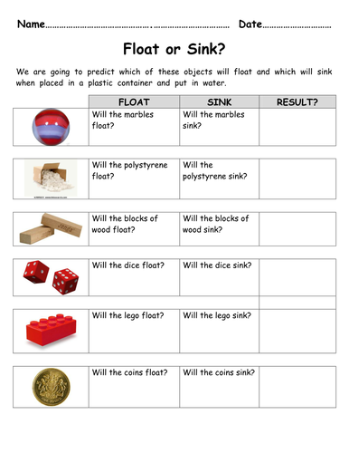 Float or Sink Worksheet - Twinkl This float or sink experiment worksheet is a great way to get children thinking about what it is that makes materials float and sink. Twinkl » Northern Ireland » Key Stage 1 - Year 1, Year 2 » STEM. What do members download after viewing this? Science Floating and Sinking Investigation Prompt Display Poster.