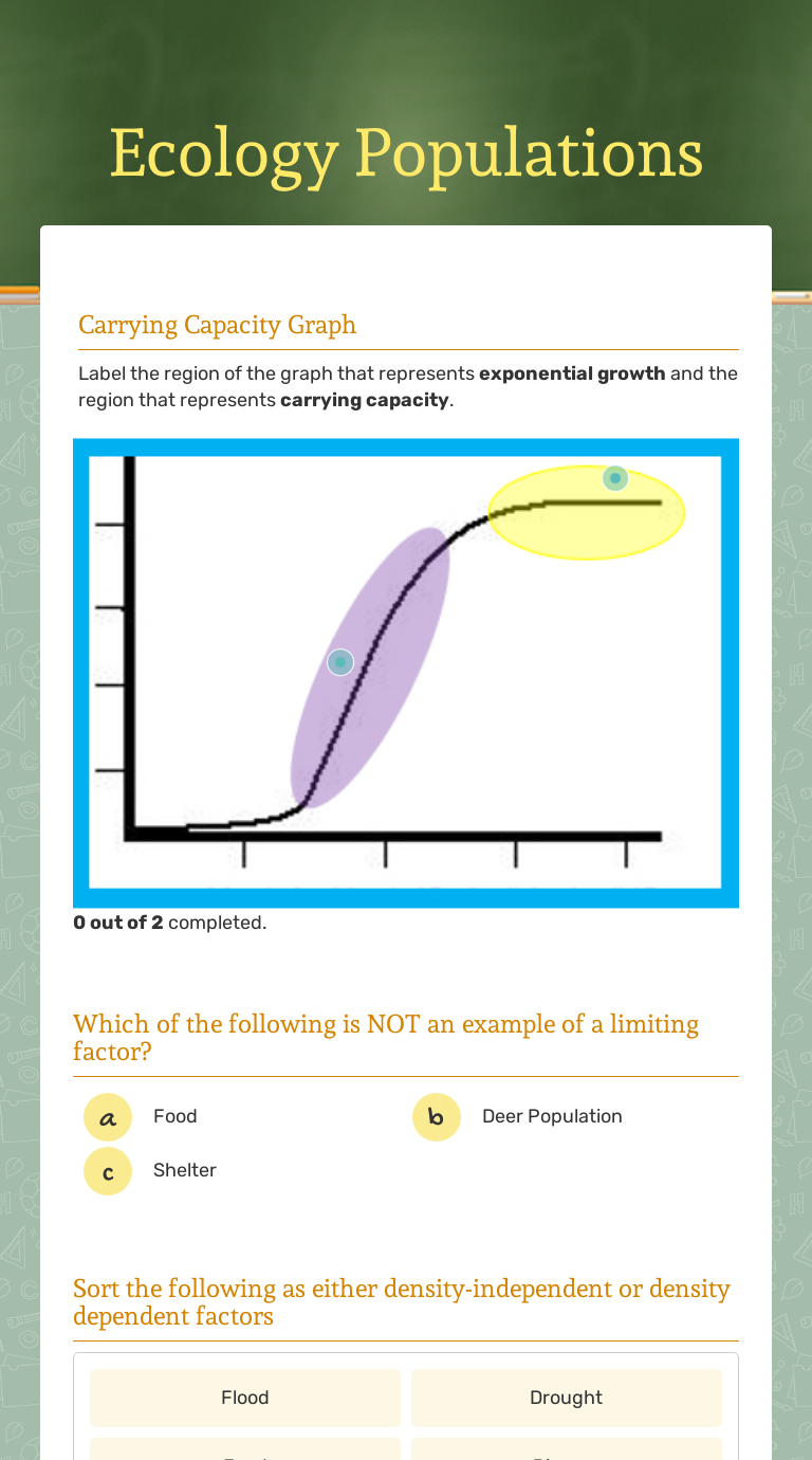 PDF Population Ecology Graph Worksheet - Mrs. Slovacek's Science Population Ecology Graph Worksheet Directions: Look at the graphs below and answer the following questions. Graphs 1 - Exponential Growth and Carrying Capacity 1. Which of the two curves exhibits exponential growth? _____ 2. Which of the two curves exhibits a carrying capacity? _____ 3. What is the carrying capacity of this graph? _____ 4.