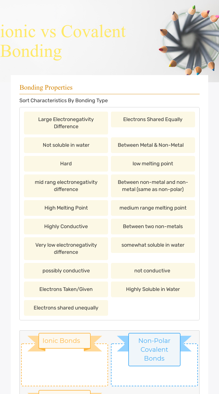 DOC Chemistry Worksheet Introduction to Chemical Bonding Name Worksheet #3 Continued. 1. Draw the bonds below: a) phosphorus . triodide (PI3) b) bromine (Br2) c) water (H2O) d) ammonia (NH3) 2. EXTRA CHALLENGE: Determine if it is an ionic bond or a covalent bond. Show the work and the final answer. Remember: Covalent bonds form between two nonmetals that share electrons. PDF Chemistry A Bonding - Weebly Chemistry - Bonding Packet Name:_____ Hr:_____ Page 5 5 Updated 3/31/2017 Worksheet #4: Introduction to Covalent Bonds A covalent bond is formed between nonmetal atoms. The nonmetals are connected by a shared pair of valence electrons. Chemical Bonding Ionic And Covalent Worksheet Answers ... Describe the type of bonding that occurs in the compound. The electrons are equally shared. Some of the worksheets displayed are covalent bonding work key chemical bonding work ionic and covalent compounds name key chapter 8 covalent bonding work answer key pdf trom. For example boron atoms bonded to oxygen atoms are covalent. Chemical Bonding An Introductory Webquest Answer Key ... Student name Date Chemical Bonding web quest Introduction to bonding 1. Chemical bonding kyrene school district download chemical bonding webquest chart answers chemical bonding webquest chart pdf learn and research science this worksheet and answer key is a great way to assess students prior knowledge of ionic and covalent bonding it is.