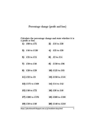 Worksheets on Profit and Loss Percentage | Gain & Loss ... In this worksheet, we can see questions on Profit and Loss percentage. Here we can see about profit and loss percent in which profit means the amount which we gained after selling a product and profit percent means the percent which is calculated with the Cost price in the base. And loss means when we sold an item or a product less than it's ...