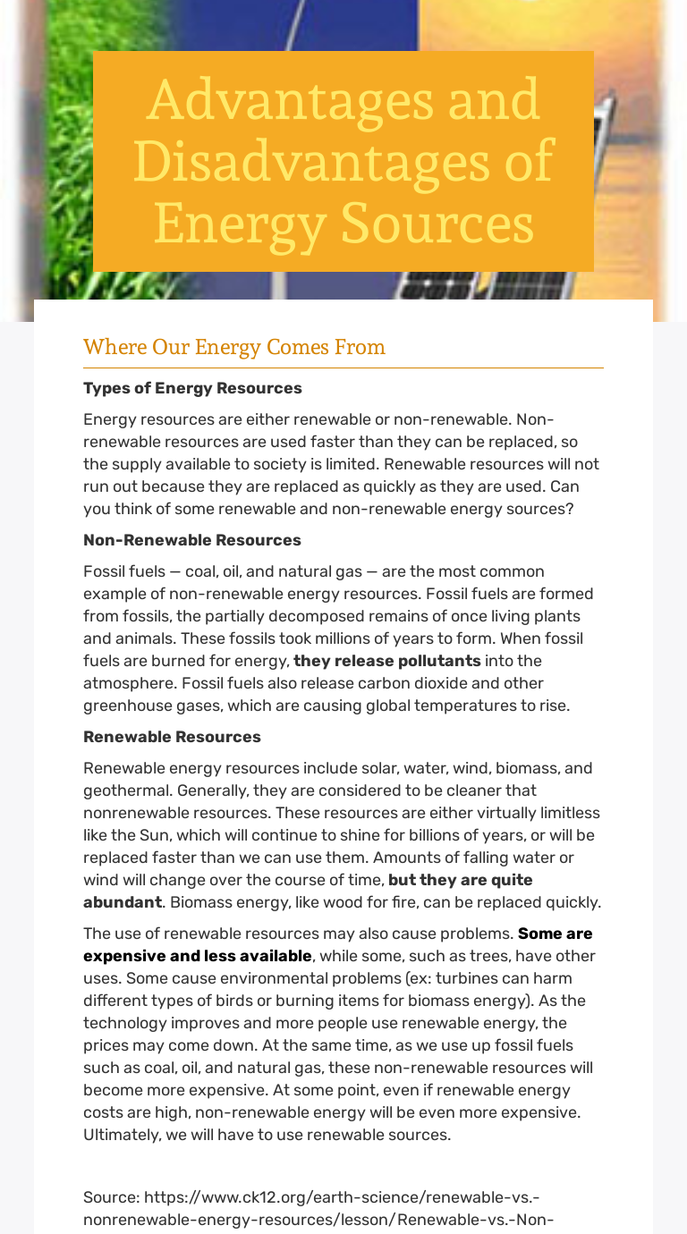 Where does energy come from? - Mystery Science In this lesson, students analyze the advantages and disadvantages of different sources of energy, including burnable fuels and alternative (renewable) energies. In the activity, Power this Town, students obtain and combine information about wind energy, solar energy, and water energy.