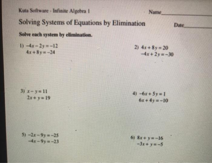 Name_hey Solving Systems of Equations by Elimination Date Kuta Software - Infinite Algebra 1. Name. Name_hey. Solving Systems of Equations by Elimination Date_. Period. Solve each system by elimination.2 pages