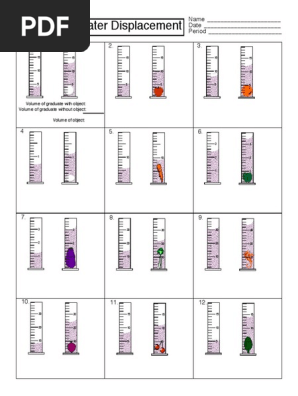 Volume by water displacement worksheet answer key. Volume by displacement | Volume worksheets, Density worksheet... Volume Worksheets | Free - Distance Learning, worksheets and more: CommonCoreSheets. The best source for free volume worksheets. Students will explore the difference in finding the volume of regular vs irregular objects as well as the method of water displacement. Finding Volume—The Water Displacement... | Middle School Chemistry Finding Volume: The Water Displacement Method. Key Concepts. A submerged object displaces a volume of liquid equal to the volume of the object. One milliliter (1 mL) of water has a volume of 1 cubic centimeter (1cm3). Different atoms have different sizes and masses. Atoms on the periodic table... water_displacement_worksheet_key.pdf - | Course Hero View Homework Help - water_displacement_worksheet_key.pdf from ESC 1000C at St. Petersburg College. water_displacement_worksheet_key.pdf PDF Volume by water displacement worksheet answer key Volume of water displacement worksheet great patent toys for toys and pinterest water projects. 1 2 3 1 2 3 6 Some of the displayed worksheets are volume by water offset rock and boat work key finding volume offset volume method solid volume lab name graded cylinders name answers key...