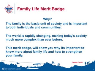 29 Boy Scout Family Life Merit Badge Worksheet - Worksheet... Family Life Merit Badge 1. Boy Scouts of America 2. Prepare an outline on what a family is and discuss this with your Merit Badge Counselor. Tell why families are important to individuals and to society. Discuss how the actions of one member can affect other members.