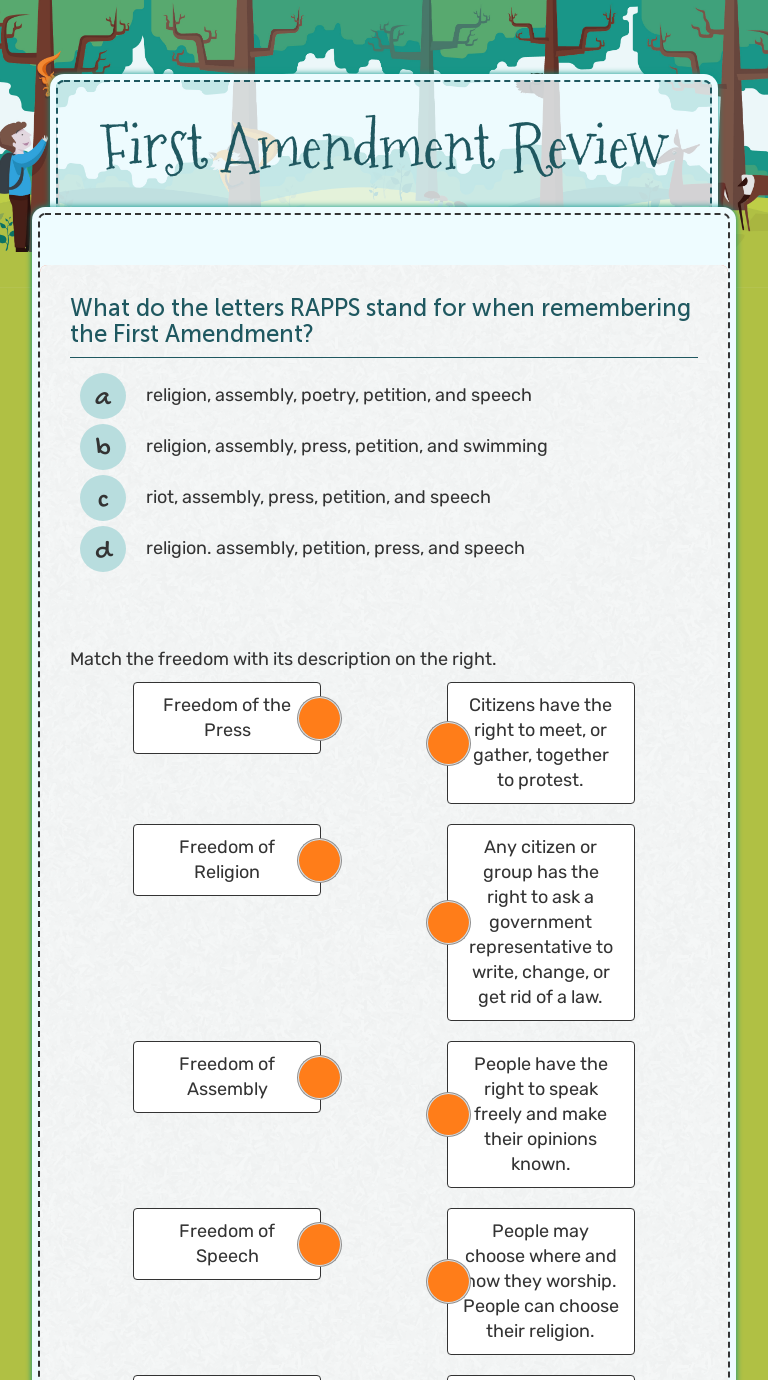 Freedom of speech worksheet. PDF Lesson Plan: Free Speech or Hate Speech? 2. Using the "Freedom of Speech" Handout, review what the actual amendment says. Be sure that everyone understands the commentary from the two Supreme Court Justices. Especially underscore the notion that political speech is interpreted as being a key to democracy and therefore is highly protected, but speech that is deemed intentionally Freedom of Speech - EnglishClub ESL Forums Freedom of Expression is a broader term than Freedom of Speech including, as it does, forms of expression other than speech - books, banners and even forms of artistic expression, for example. In addition, it protects the right to search for, receive and communicate information and ideas as well as covering the means by which information and ... PDF Freedom of Speech Case Study Worksheet - Intel Freedom of Speech Case Study Worksheet Instructions Does freedom of speech extend to a school newspaper? Read the following scenario and consider the issue of free speech in this instance. Afterwards, research all facets of the issue and develop an opinion. As you create your slideshow presentation, support your argument with specific references. PDF The First Amendment: Freedoms of Speech and Press Video ... The First Amendment: Freedoms of Speech and Press Video Worksheet Key Terms: Define each of the following terms. Bill of Rights Unalienable rights Freedom of the press Freedom of speech Freedom of opinion Alien and Sedition Acts Key People: Explain each of the following persons' views on the First Amendment using