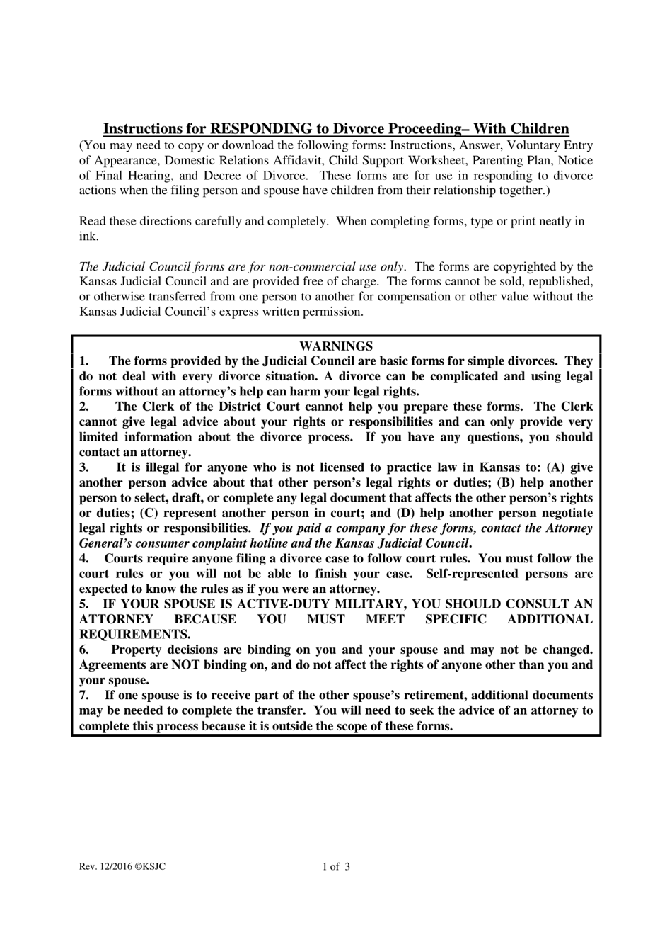 PDF 12-2016 Instructions for Divorce With Children 13. If the judge orders one parent to pay child support, the parent receiving the child support may enforce the child support order through the district court trustee's office (if available) or the Kansas Department For Children and Families Child Support Services (DCF CSS) office. You may contact DCF CSS by calling toll free at 1-888-757-2445. Filing a Petition for Divorce | Kansas Judicial Council The Kansas Bar Association's Lawyer Referral Service provides answers to many questions such as how to find a lawyer, services available to the public, and the potential fees and costs involved. It may also allow you to talk with a lawyer who can answer your questions for only $2 per minute. Positive Discipline and Child Guidance | MU Extension At times, adult expectations may be beyond children's abilities. Discipline and guidance strategies should take into account a child's unique needs and developmental level. Birth to about age 2. Children need support, contact and loving interactions. If the caregiver is absent, the child may fear that they will not return. 39 kansas child support worksheet 2016 - Worksheet Was Here E-FILE The Bradley Kansas Child Support Worksheet. Posted on March 20, 2015 by Brad Short. The protocol for e-filing in Kansas courts requires (with only a single exception) that any document (such as an order or child support worksheet) which needs a judge's signature to become effective must be filed as a Word* document.