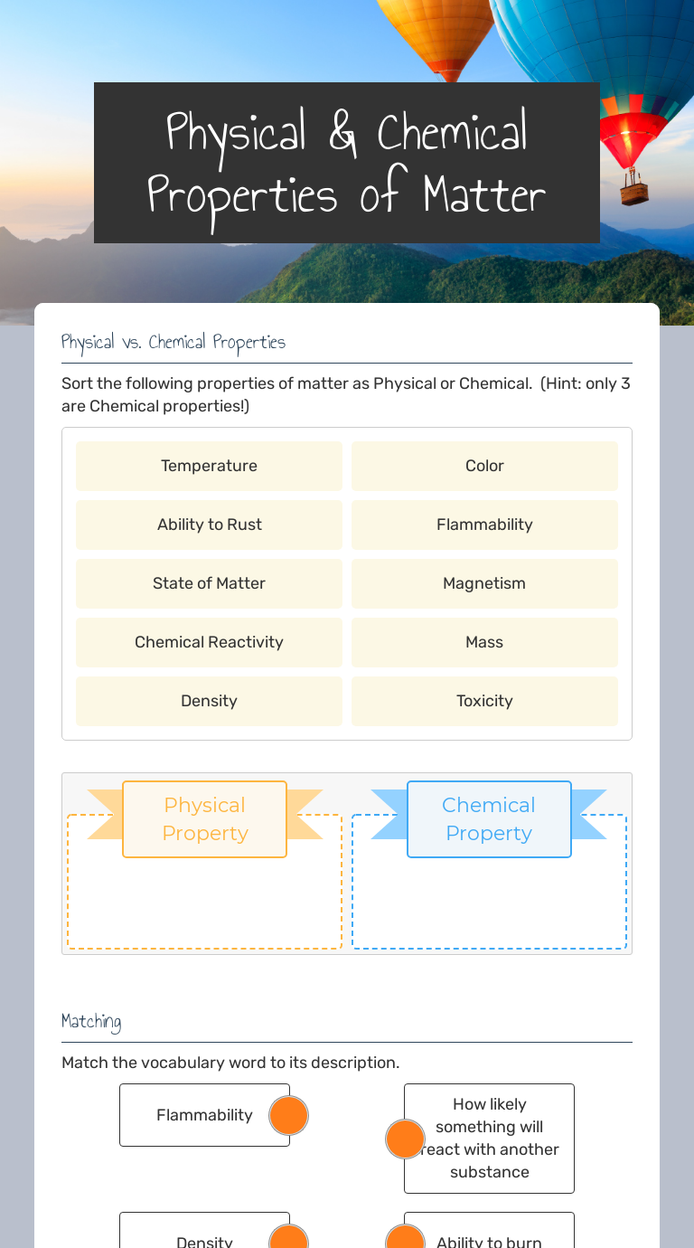Physical vs Chemical Properties worksheet ID: 1124844 Language: English School subject: Chemistry Grade/level: 10 Age: 14-18 Main content: Physical & Chemical Properties Other contents: Add to my workbooks (16) Download file pdf Embed in my website or blog Add to Google Classroom