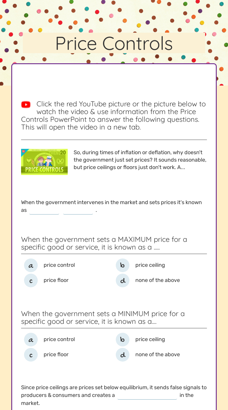 Chapter 8: Price Ceilings and Floors Flashcards | Quizlet A. a price ceiling of $6. B. a price ceiling of $10. C. a price floor of $6. D. a price floor of $10. A. a price ceiling of $6. Because of government price controls, a business must now sell soft-serve ice cream at half its original price. This business might respond by: A. offering smaller servings of ice cream. 9 price ceilings and price floors worksheet answers ... Jan 10, 2022 · All of the answers are correct. Aug 26, 2018 — Answer Sheet Worksheet: Price Ceilings and Price Floors 1. A store sells cheddar cheese by the pound. The chart reflects the quantity ... Price floors and ceilings can be plotted with supply and demand curves. Use the above graph to answer the questions.