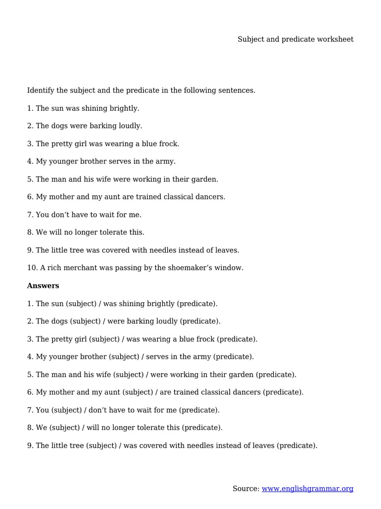Subject Predicate Worksheet | Teachers Pay Teachers L.4.1.F - Simple Subject and Predicate: This fun worksheet bundle includes 5 worksheets, with a corresponding answer key on simple subject and predicate. The pdf is high resolution, and made to fit 8.5" 11" paper seamlessly.In this set we cover simple subject and predicate, students underline subje PDF WORKSHEET 5 Finding Subjects and Predicates WORKSHEET 5 Finding Subjects and Predicates NAME CLASS DATE Exercise A Use a vertical line to separate the complete subject and the complete predicate in each of the following sentences. EXAMPLE 1. Dad bought a new car last week. 1. This new car is a blue-and-white four-door sedan. 2. It has a sunroof and an automatic transmission. 3. Subject and predicate worksheet - englishgrammar.org Subject and predicate worksheet Author: Home of English Grammar Created Date: 20220304135747+00'00' ...
