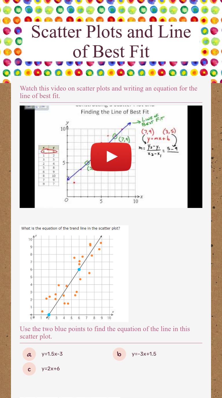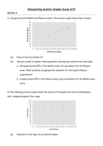 Scatter plot and line of best fit worksheet. Scatter Graphs Worksheet - KS3/ GCSE | Teaching Resources 7.11.2014 · A scatter graphs GCSE worksheet in which students are required to plot missing points, describe the correlation and the practical interpretations, and then draw a line of best fit. Can be extended if you pose questions on using the line of best fit to estimate one variable given a value for the other. Scatter Plots - cdn.kutasoftware.com Worksheet by Kuta Software LLC Find the slope-intercept form of the equation of the line that best fits the data. 7) X Y X Y X Y 2 150 41 640 91 800 11 280 50 680 97 770 27 490 63 770 98 790 27 500 Construct a scatter plot. Find the slope-intercept form of the equation of the line that best fits the data and its r² value. 8) X Y X Y 0.12,000 ... How to make a scatter plot in Excel - Ablebits 3.10.2018 · Add a trendline and equation. To better visualize the relationship between the two variables, you can draw a trendline in your Excel scatter graph, also called a line of best fit.. To have it done, right click on any data point and choose Add Trendline… from the context menu.. Excel will draw a line as close as possible to all data points so that there are as many points … Residual Plots: Definition & Example - Video & Lesson ... 14.12.2021 · Residual & Residual Plot: Definition. Imagine you want to see if you can predict a person's height based on their hand span. You measured the hand span and height of everyone in your class at school.