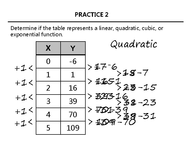 PDF 10.8 Compare Linear, Exponential, and Quadratic Models Use differences or ratios to tell whether the table of values represents a linear function, an exponential function, or a quadratic function. ANSWER The table of values represents a quadratic function. x -2 -1 0 1 2 y -6 -6 -4 0 6 First differences: 0 2 4 6