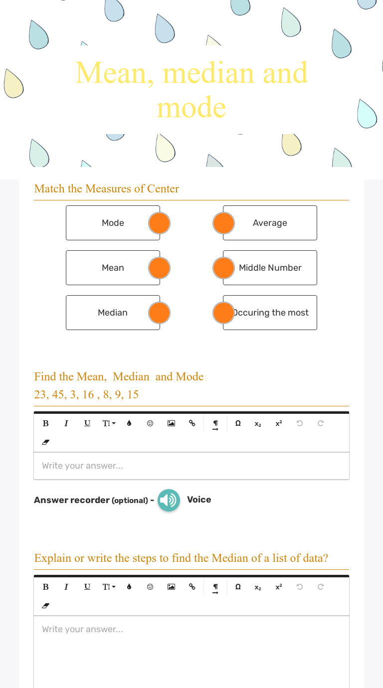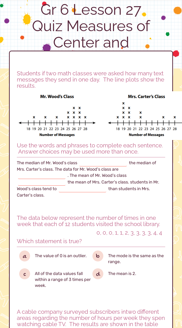 The measures of center worksheet | Email my answers to my teacher Measures of center online worksheet for 6. You can do the exercises online or download the worksheet as pdf. ID: 1990393 Language: English School subject: Math Grade/level: 6 Age: 11-12 Main content: Measures of center Other contents