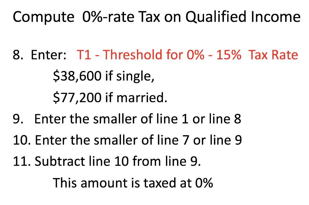 Solved: Qualified dividends and capital gain tax worksheet ... Following this example, there is a simple way to calculate the tax: With $700,000 in both qualified dividends and capital gains, the tax should be: (a) 15% of $479,000, or $71,850 plus (b) 20% of the difference between $700,000 and $479,000, or $44,200 plus (c) the tax on $200,000 taxable income that is neither qualified dividends nor capital ...