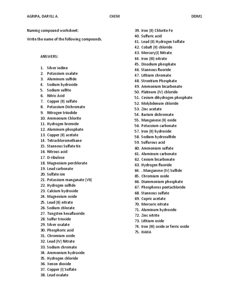 Chemistry Naming Ionic Compounds Practice Worksheet ... Answers naming chemical compounds 1 nabr sodium bromide 2 ca c 2 h 3 o 2 2 calcium acetate 3 p 2 o 5 diphosphorus pentoxide 4 ti so 4 2 titanium iv sulfate. A binary compound is a compound formed from two different elements. Csus chemistry 1a e nomenclature worksheet dr. 8 aluminum chloride alcl3. 6 potassium iodide ki.