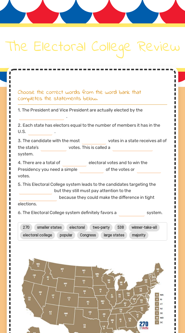 Electoral College Worksheet Pdf - worksheet Electoral college worksheet pdf. Amendment across 6 electoral college no space 7 electoral votes no space 8 popular votes no space electoral map puzzle page 106 1 70 2. A total of 538 electors. Pdf 24 59 mb. Color code each state according to the key at the right pick your own colors. The electoral college name.