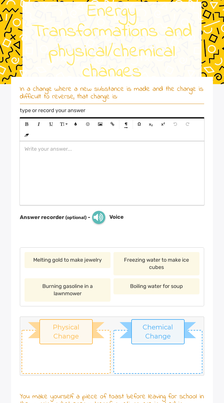 PDF ENERGY TRANSFORMATION OBJECT - Qld Science Teachers Energy transformations occur when one type of energy changes to a different type of energy in the same object. Examples include: Electric light - Electrical energy Light energy Food - Chemical potential energy Heat and kinetic Look at the pictures. In the table below, match the energy transformation with the object pictured.