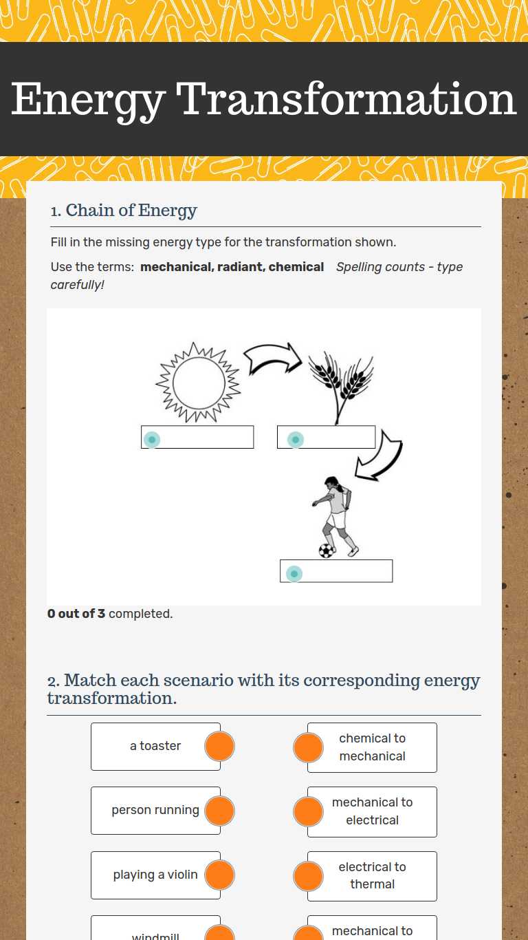 Energy transformation worksheet - Liveworksheets.com ID: 61902 Language: English School subject: SCIENCE Grade/level: 4TH AND 5TH Age: 8-11 Main content: Energy Other contents: Add to my workbooks (58) Download file pdf Embed in my website or blog Add to Google Classroom