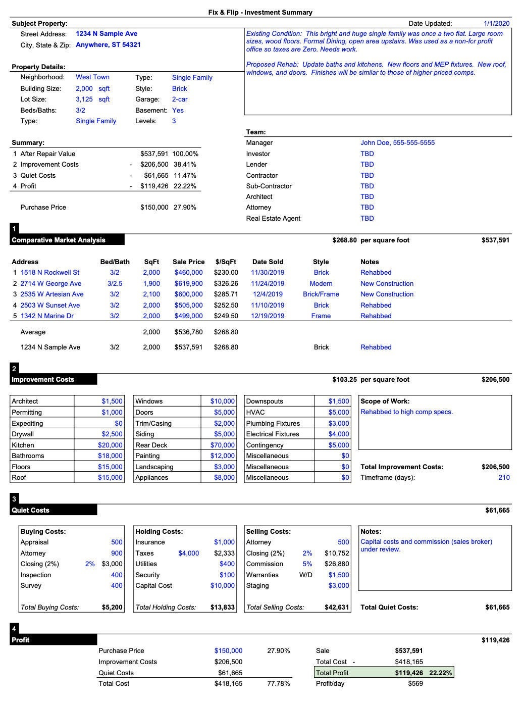 Real Estate House Flipping Business Plan Template Sample ... Click here to view more details of this real estate house flipping business plan template. House Flipping Business Plan Template - $47.00. +Add Excel Worksheet (Recommended) - $35.00. +Add Funding Package Pitch Deck PowerPoint + 4 funding eBooks - $55.00. +Add Raising Capital Documents Bundle. 115 documents - $85.00. Repair Cost Calculator | Home renovation costs, Remodeling ... The NAHB recently published its latest Cost of Construction Survey. The survey shows that the average home was built on 20,129 square feet (about a half an acre) of land, had 2,802 square feet of finished space, and sold for an average of $468,318. Results further show that 61.8 percent of the average home sale... House Flipping Spreadsheet Templates - Google Search The House Flipping Spreadsheet Review is a software package that helps you tackle your house flip from the ground up. It is one of the best products on the market because it allows you to manage...
