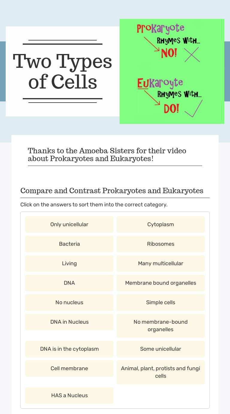 Prokaryotic And Eukaryotic Cells Worksheets & Teaching ... Prokaryotic or Eukaryotic Cell? This is a fun and meaningful way to practice determining the difference between Prokaryotic and Eukaryotic Cells! Students will read a sentence or word and decide which type of cell it is describing, then glue the box in the correct column. An answer key is included.